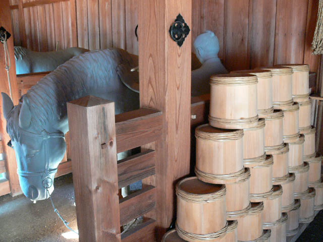 厩(うまや)の中には、いろいろな消火のための道具がしまわれていました。火の粉を払う大きな団扇、水を入れてそのまま火に向かって投げる桶、そして鎌や熊手、鳶口(とびくち)などです。江戸時代には、この鎌や熊手、鳶口を使って、火事が燃え広がらないようにと、周辺の家や物を壊してしまいました。